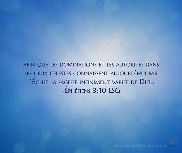 afin que les dominations et les autorités dans les lieux célestes connaissent aujourd'hui par l'Église la sagesse infiniment variée de Dieu, -Éphésiens 3:10 LSG