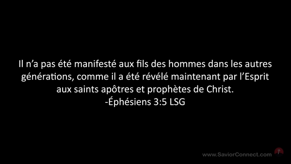 Il n'a pas été manifesté aux fils des hommes dans les autres générations, comme il a été révélé maintenant par l'Esprit aux saints apôtres et prophètes de Christ. -Éphésiens 3:5 LSG
