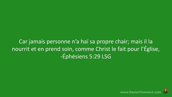 Car jamais personne n'a haï sa propre chair; mais il la nourrit et en prend soin, comme Christ le fait pour l'Église, -Éphésiens 5:29 LSG