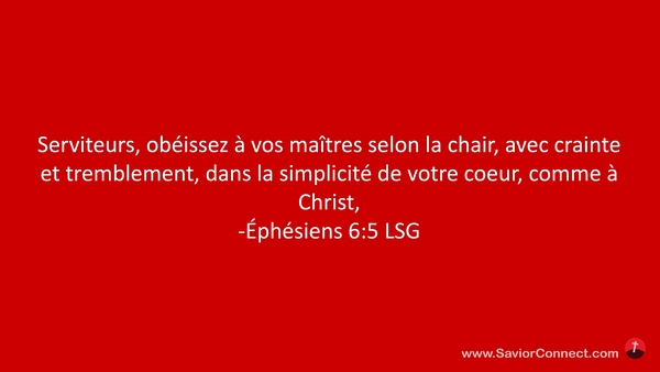 Serviteurs, obéissez à vos maîtres selon la chair, avec crainte et tremblement, dans la simplicité de votre coeur, comme à Christ, -Éphésiens 6:5 LSG