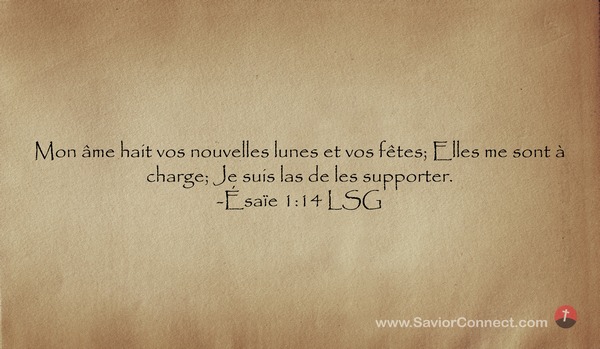 Mon âme hait vos nouvelles lunes et vos fêtes; Elles me sont à charge; Je suis las de les supporter. -Ésaïe 1:14 LSG