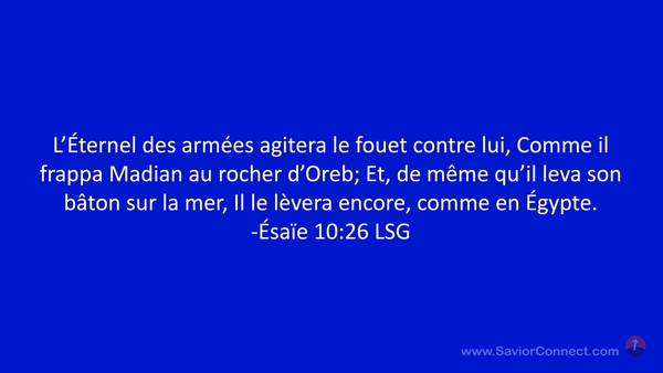 L'Éternel des armées agitera le fouet contre lui, Comme il frappa Madian au rocher d'Oreb; Et, de même qu'il leva son bâton sur la mer, Il le lèvera encore, comme en Égypte. -Ésaïe 10:26 LSG