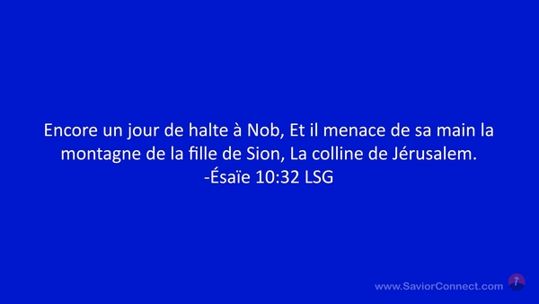 Encore un jour de halte à Nob, Et il menace de sa main la montagne de la fille de Sion, La colline de Jérusalem. -Ésaïe 10:32 LSG