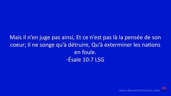 Mais il n'en juge pas ainsi, Et ce n'est pas là la pensée de son coeur; Il ne songe qu'à détruire, Qu'à exterminer les nations en foule. -Ésaïe 10:7 LSG
