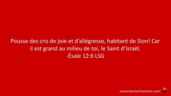 Pousse des cris de joie et d'allégresse, habitant de Sion! Car il est grand au milieu de toi, le Saint d'Israël. -Ésaïe 12:6 LSG
