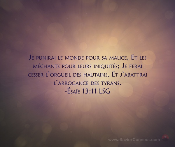 Je punirai le monde pour sa malice, Et les méchants pour leurs iniquités; Je ferai cesser l'orgueil des hautains, Et j'abattrai l'arrogance des tyrans. -Ésaïe 13:11 LSG