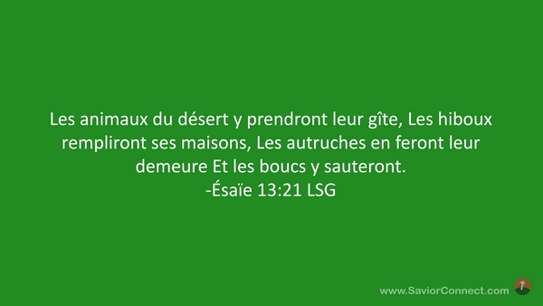 Les animaux du désert y prendront leur gîte, Les hiboux rempliront ses maisons, Les autruches en feront leur demeure Et les boucs y sauteront. -Ésaïe 13:21 LSG