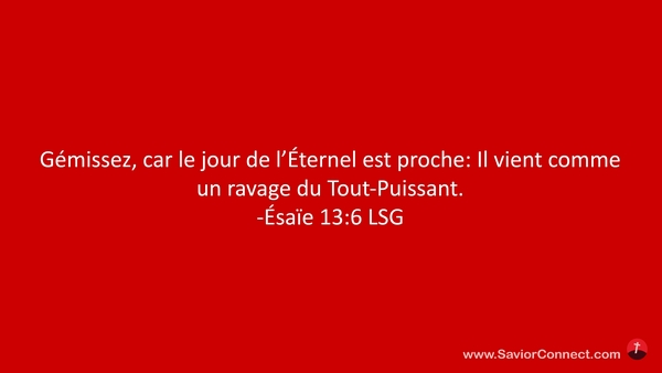 Gémissez, car le jour de l'Éternel est proche: Il vient comme un ravage du Tout-Puissant. -Ésaïe 13:6 LSG