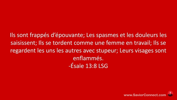 Ils sont frappés d'épouvante; Les spasmes et les douleurs les saisissent; Ils se tordent comme une femme en travail; Ils se regardent les uns les autres avec stupeur; Leurs visages sont enflammés. -Ésaïe 13:8 LSG