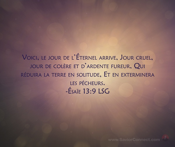 Voici, le jour de l'Éternel arrive, Jour cruel, jour de colère et d'ardente fureur, Qui réduira la terre en solitude, Et en exterminera les pécheurs. -Ésaïe 13:9 LSG