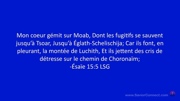 Mon coeur gémit sur Moab, Dont les fugitifs se sauvent jusqu'à Tsoar, Jusqu'à Églath-Schelischija; Car ils font, en pleurant, la montée de Luchith, Et ils jettent des cris de détresse sur le chemin de Choronaïm; -Ésaïe 15:5 LSG