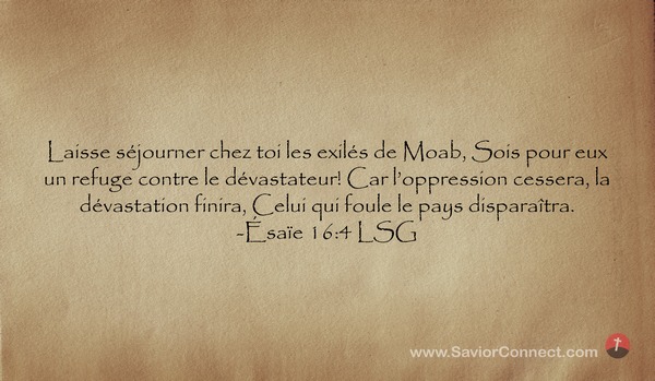 Laisse séjourner chez toi les exilés de Moab, Sois pour eux un refuge contre le dévastateur! Car l'oppression cessera, la dévastation finira, Celui qui foule le pays disparaîtra. -Ésaïe 16:4 LSG