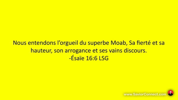 Nous entendons l'orgueil du superbe Moab, Sa fierté et sa hauteur, son arrogance et ses vains discours. -Ésaïe 16:6 LSG