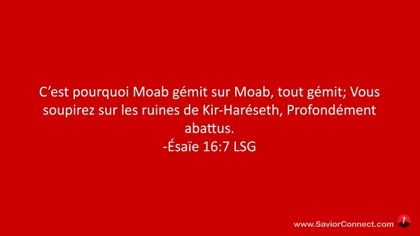 C'est pourquoi Moab gémit sur Moab, tout gémit; Vous soupirez sur les ruines de Kir-Haréseth, Profondément abattus. -Ésaïe 16:7 LSG