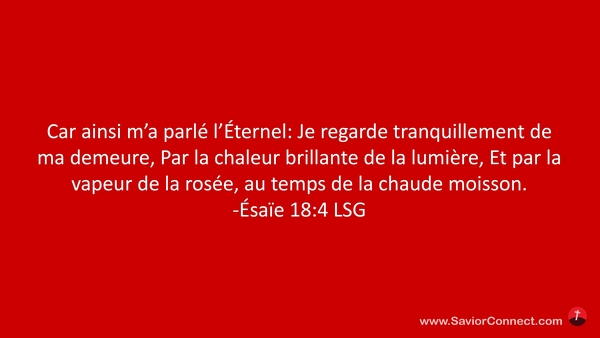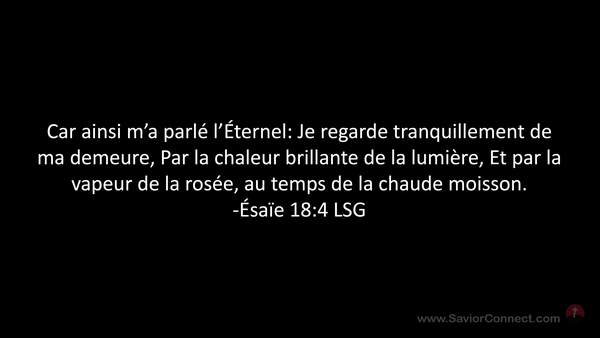 Car ainsi m'a parlé l'Éternel: Je regarde tranquillement de ma demeure, Par la chaleur brillante de la lumière, Et par la vapeur de la rosée, au temps de la chaude moisson. -Ésaïe 18:4 LSG