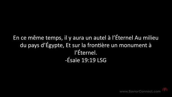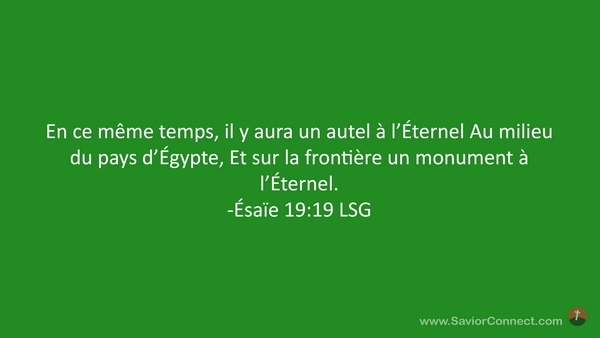 En ce même temps, il y aura un autel à l'Éternel Au milieu du pays d'Égypte, Et sur la frontière un monument à l'Éternel. -Ésaïe 19:19 LSG