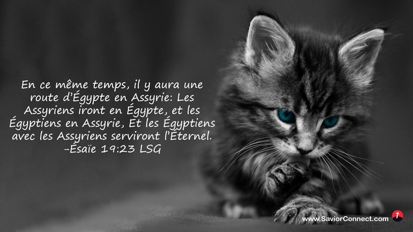 En ce même temps, il y aura une route d'Égypte en Assyrie: Les Assyriens iront en Égypte, et les Égyptiens en Assyrie, Et les Égyptiens avec les Assyriens serviront l'Éternel. -Ésaïe 19:23 LSG