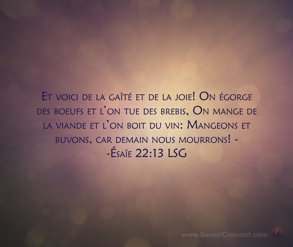 Et voici de la gaîté et de la joie! On égorge des boeufs et l'on tue des brebis, On mange de la viande et l'on boit du vin: Mangeons et buvons, car demain nous mourrons! - -Ésaïe 22:13 LSG