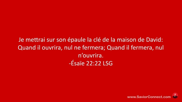 Je mettrai sur son épaule la clé de la maison de David: Quand il ouvrira, nul ne fermera; Quand il fermera, nul n'ouvrira. -Ésaïe 22:22 LSG