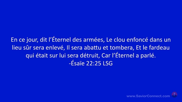 En ce jour, dit l'Éternel des armées, Le clou enfoncé dans un lieu sûr sera enlevé, Il sera abattu et tombera, Et le fardeau qui était sur lui sera détruit, Car l'Éternel a parlé. -Ésaïe 22:25 LSG