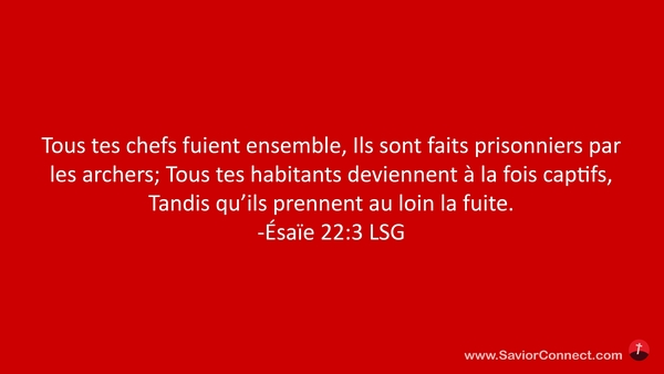 Tous tes chefs fuient ensemble, Ils sont faits prisonniers par les archers; Tous tes habitants deviennent à la fois captifs, Tandis qu'ils prennent au loin la fuite. -Ésaïe 22:3 LSG