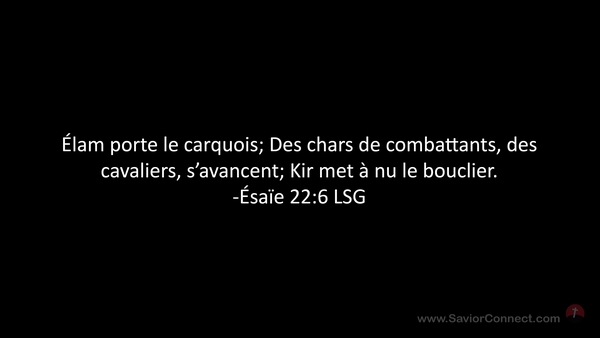 Élam porte le carquois; Des chars de combattants, des cavaliers, s'avancent; Kir met à nu le bouclier. -Ésaïe 22:6 LSG