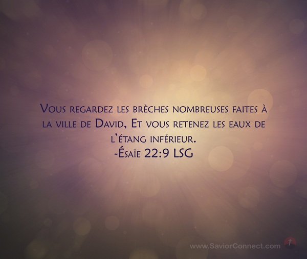 Vous regardez les brèches nombreuses faites à la ville de David, Et vous retenez les eaux de l'étang inférieur. -Ésaïe 22:9 LSG