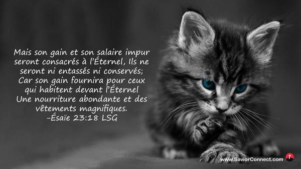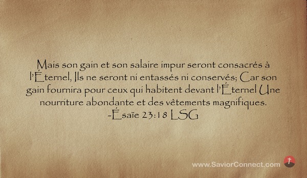 Mais son gain et son salaire impur seront consacrés à l'Éternel, Ils ne seront ni entassés ni conservés; Car son gain fournira pour ceux qui habitent devant l'Éternel Une nourriture abondante et des vêtements magnifiques. -Ésaïe 23:18 LSG