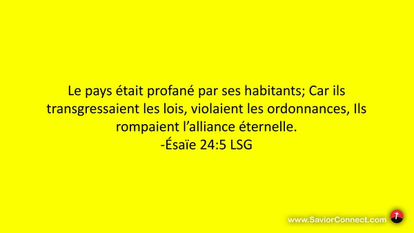 Le pays était profané par ses habitants; Car ils transgressaient les lois, violaient les ordonnances, Ils rompaient l'alliance éternelle. -Ésaïe 24:5 LSG
