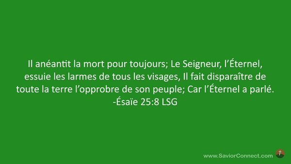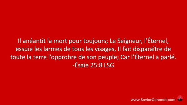 Il anéantit la mort pour toujours; Le Seigneur, l'Éternel, essuie les larmes de tous les visages, Il fait disparaître de toute la terre l'opprobre de son peuple; Car l'Éternel a parlé. -Ésaïe 25:8 LSG