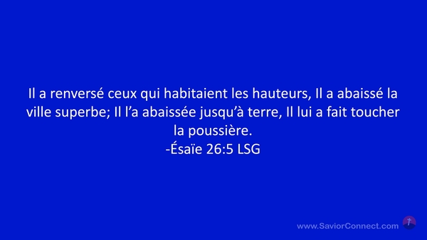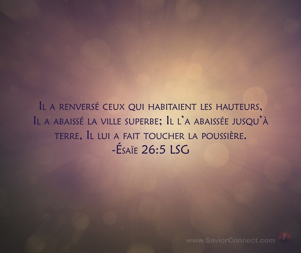 Il a renversé ceux qui habitaient les hauteurs, Il a abaissé la ville superbe; Il l'a abaissée jusqu'à terre, Il lui a fait toucher la poussière. -Ésaïe 26:5 LSG