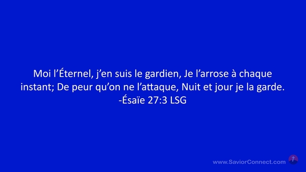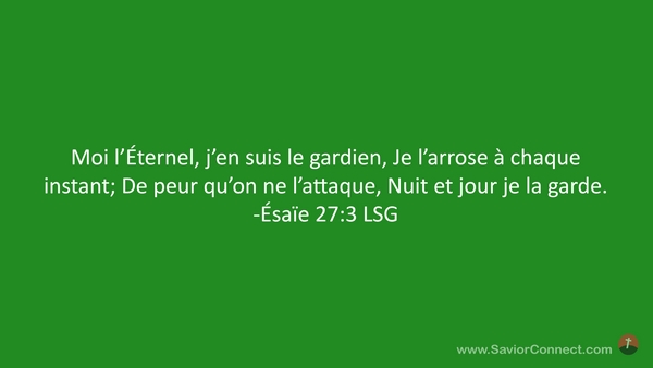 Moi l'Éternel, j'en suis le gardien, Je l'arrose à chaque instant; De peur qu'on ne l'attaque, Nuit et jour je la garde. -Ésaïe 27:3 LSG
