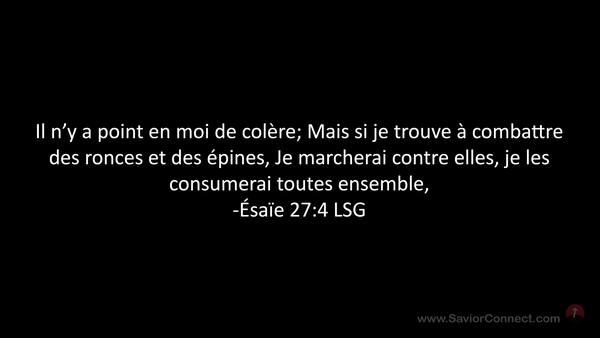 Il n'y a point en moi de colère; Mais si je trouve à combattre des ronces et des épines, Je marcherai contre elles, je les consumerai toutes ensemble, -Ésaïe 27:4 LSG