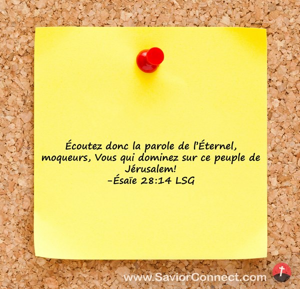 Écoutez donc la parole de l'Éternel, moqueurs, Vous qui dominez sur ce peuple de Jérusalem! -Ésaïe 28:14 LSG