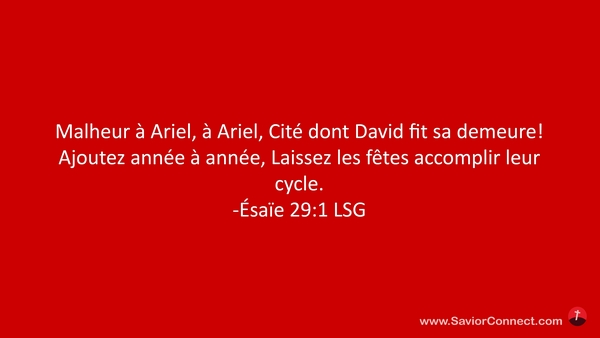 Malheur à Ariel, à Ariel, Cité dont David fit sa demeure! Ajoutez année à année, Laissez les fêtes accomplir leur cycle. -Ésaïe 29:1 LSG