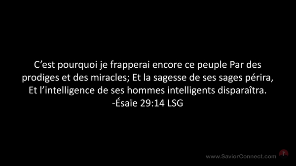 C'est pourquoi je frapperai encore ce peuple Par des prodiges et des miracles; Et la sagesse de ses sages périra, Et l'intelligence de ses hommes intelligents disparaîtra. -Ésaïe 29:14 LSG