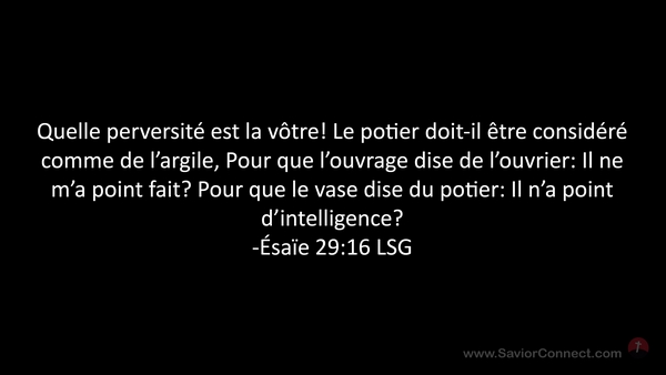 Quelle perversité est la vôtre! Le potier doit-il être considéré comme de l'argile, Pour que l'ouvrage dise de l'ouvrier: Il ne m'a point fait? Pour que le vase dise du potier: Il n'a point d'intelligence? -Ésaïe 29:16 LSG