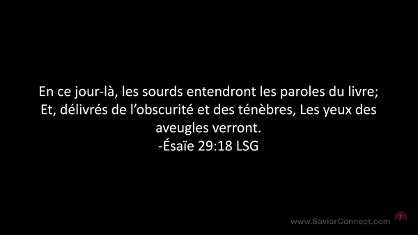 En ce jour-là, les sourds entendront les paroles du livre; Et, délivrés de l'obscurité et des ténèbres, Les yeux des aveugles verront. -Ésaïe 29:18 LSG
