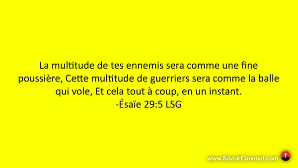 La multitude de tes ennemis sera comme une fine poussière, Cette multitude de guerriers sera comme la balle qui vole, Et cela tout à coup, en un instant. -Ésaïe 29:5 LSG