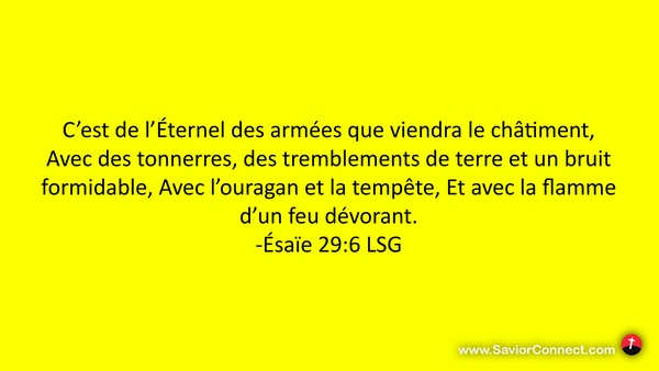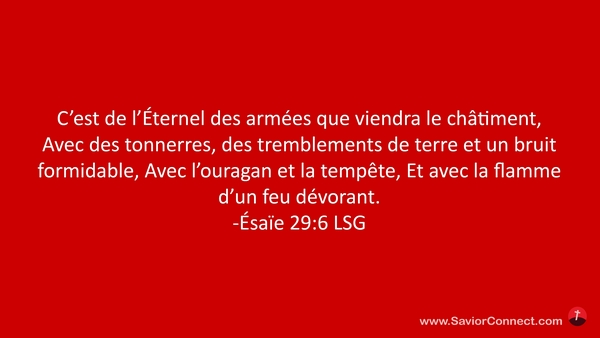 C'est de l'Éternel des armées que viendra le châtiment, Avec des tonnerres, des tremblements de terre et un bruit formidable, Avec l'ouragan et la tempête, Et avec la flamme d'un feu dévorant. -Ésaïe 29:6 LSG