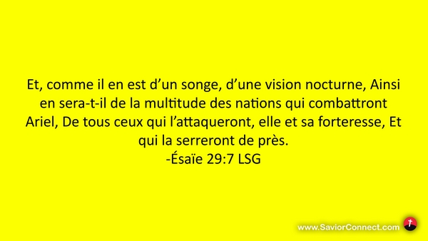 Et, comme il en est d'un songe, d'une vision nocturne, Ainsi en sera-t-il de la multitude des nations qui combattront Ariel, De tous ceux qui l'attaqueront, elle et sa forteresse, Et qui la serreront de près. -Ésaïe 29:7 LSG