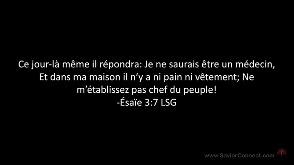 Ce jour-là même il répondra: Je ne saurais être un médecin, Et dans ma maison il n'y a ni pain ni vêtement; Ne m'établissez pas chef du peuple! -Ésaïe 3:7 LSG