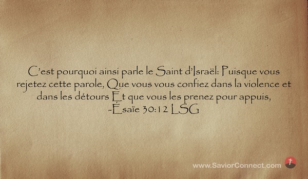 C'est pourquoi ainsi parle le Saint d'Israël: Puisque vous rejetez cette parole, Que vous vous confiez dans la violence et dans les détours Et que vous les prenez pour appuis, -Ésaïe 30:12 LSG