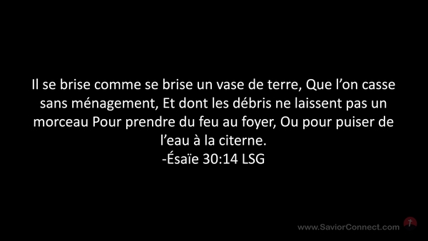 Il se brise comme se brise un vase de terre, Que l'on casse sans ménagement, Et dont les débris ne laissent pas un morceau Pour prendre du feu au foyer, Ou pour puiser de l'eau à la citerne. -Ésaïe 30:14 LSG