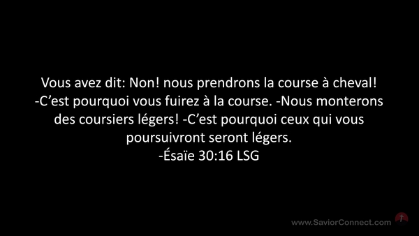 Vous avez dit: Non! nous prendrons la course à cheval! -C'est pourquoi vous fuirez à la course. -Nous monterons des coursiers légers! -C'est pourquoi ceux qui vous poursuivront seront légers. -Ésaïe 30:16 LSG
