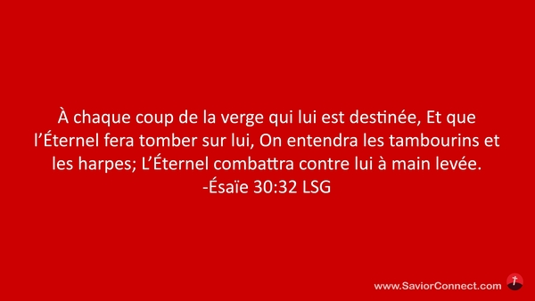 À chaque coup de la verge qui lui est destinée, Et que l'Éternel fera tomber sur lui, On entendra les tambourins et les harpes; L'Éternel combattra contre lui à main levée. -Ésaïe 30:32 LSG