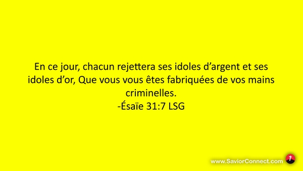 En ce jour, chacun rejettera ses idoles d'argent et ses idoles d'or, Que vous vous êtes fabriquées de vos mains criminelles. -Ésaïe 31:7 LSG