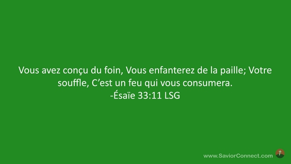 Vous avez conçu du foin, Vous enfanterez de la paille; Votre souffle, C'est un feu qui vous consumera. -Ésaïe 33:11 LSG