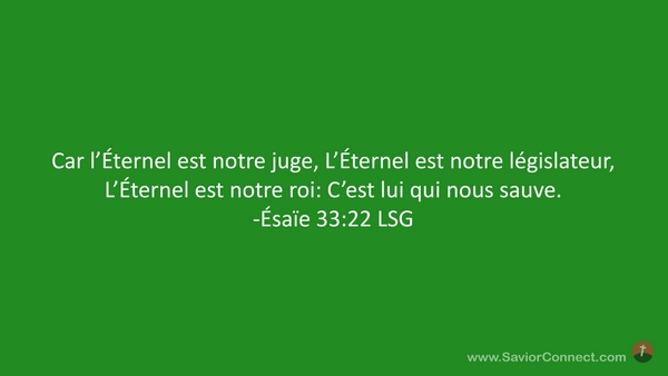 Car l'Éternel est notre juge, L'Éternel est notre législateur, L'Éternel est notre roi: C'est lui qui nous sauve. -Ésaïe 33:22 LSG