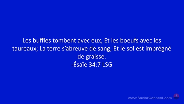 Les buffles tombent avec eux, Et les boeufs avec les taureaux; La terre s'abreuve de sang, Et le sol est imprégné de graisse. -Ésaïe 34:7 LSG